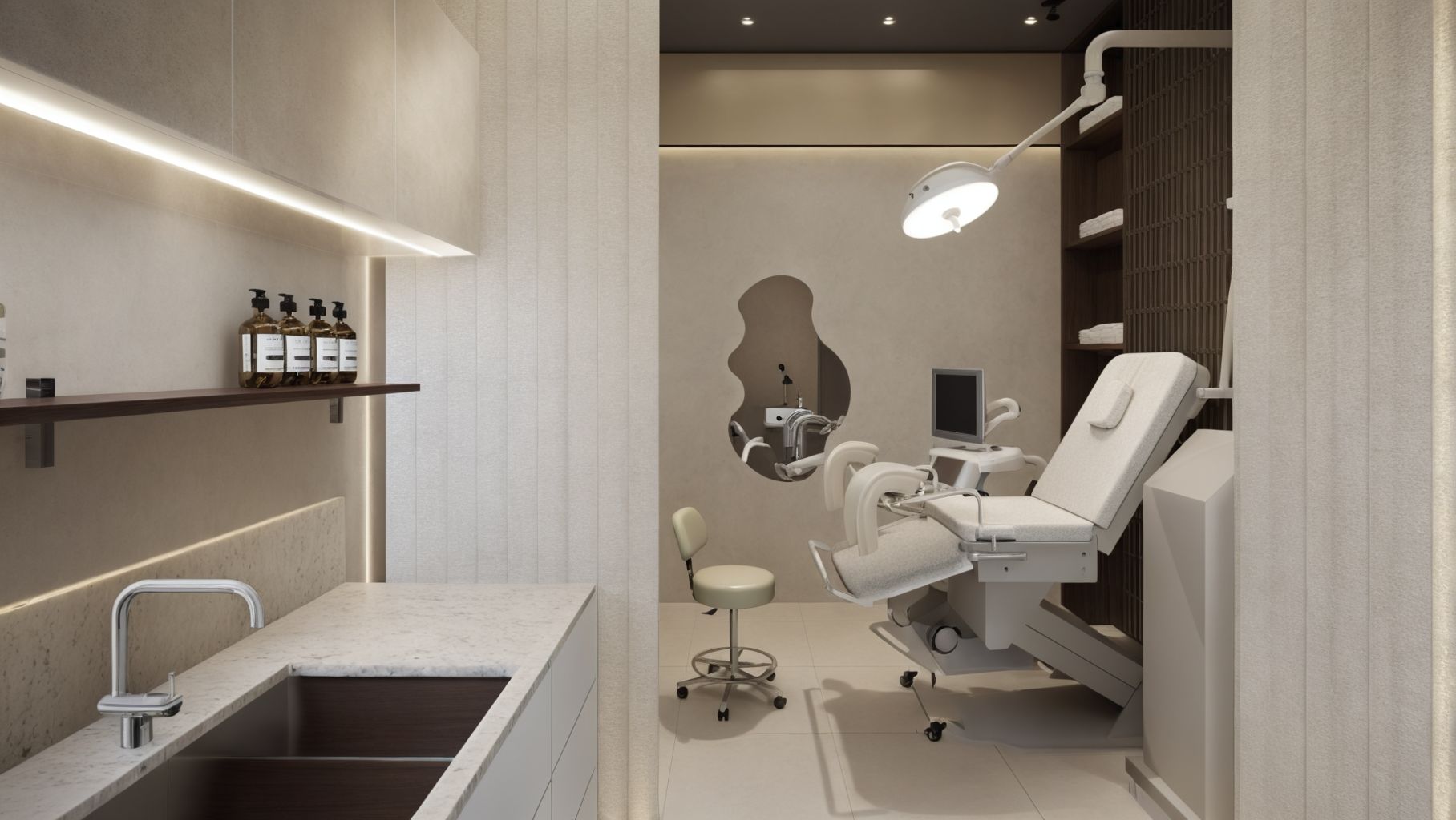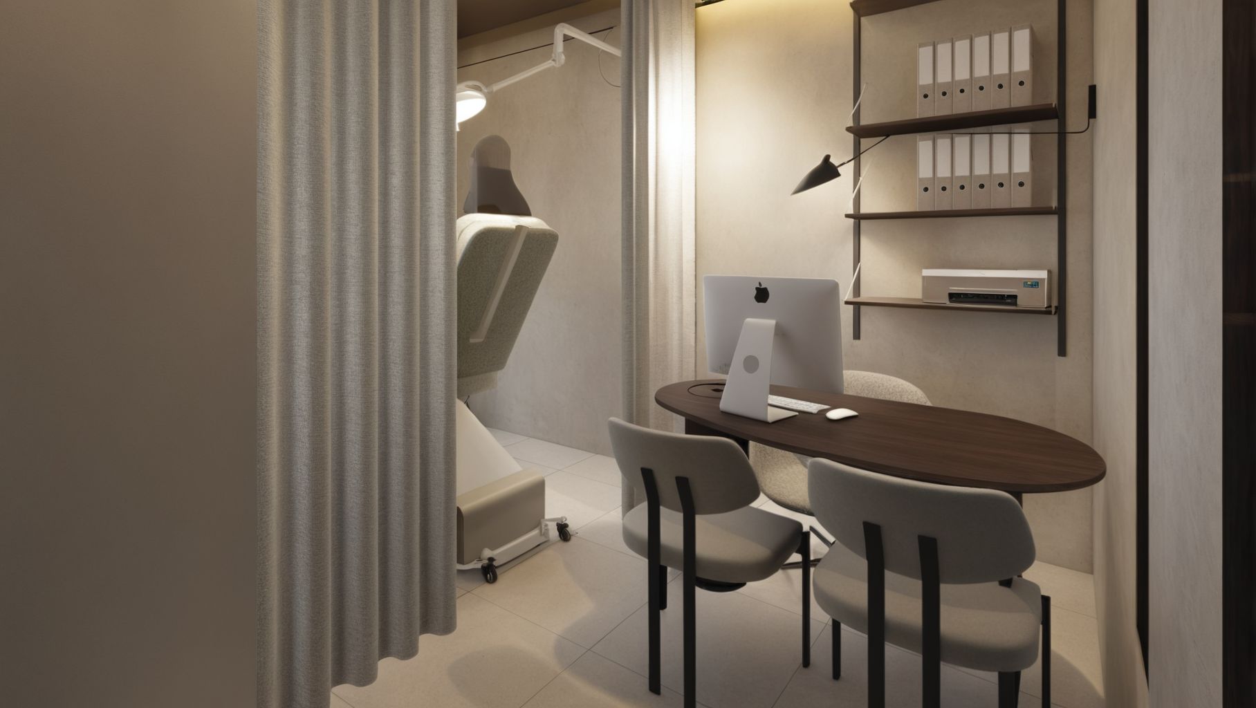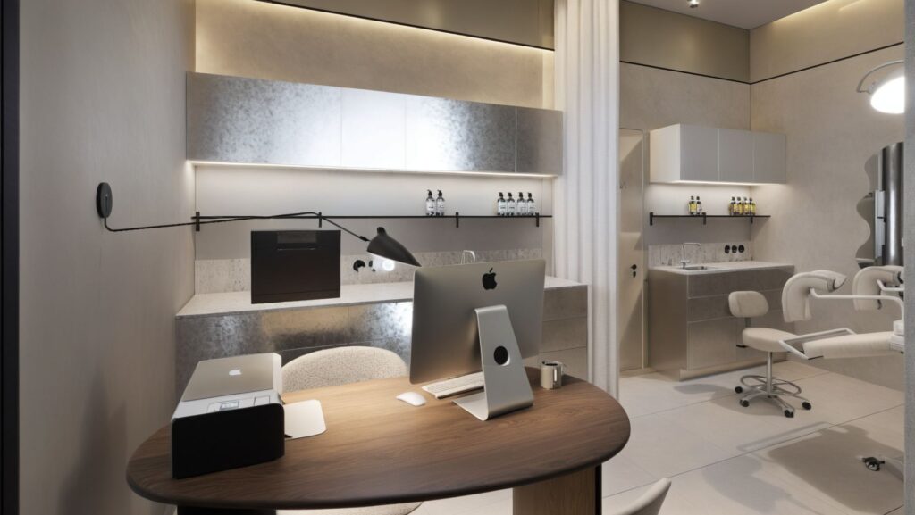 Projekt Colpo Clinic w Galerii Ursynów wyróżnia się minimalistycznym designem z mikrocementowymi podłogami, oliwkowymi akcentami oraz stalowymi meblami. Połączenie neutralnych kolorów, naturalnych faktur i nowoczesnych materiałów tworzy eleganckie, uspokajające wnętrze, łącząc industrialną elegancję z przyjazną atmosferą dla pacjentów.