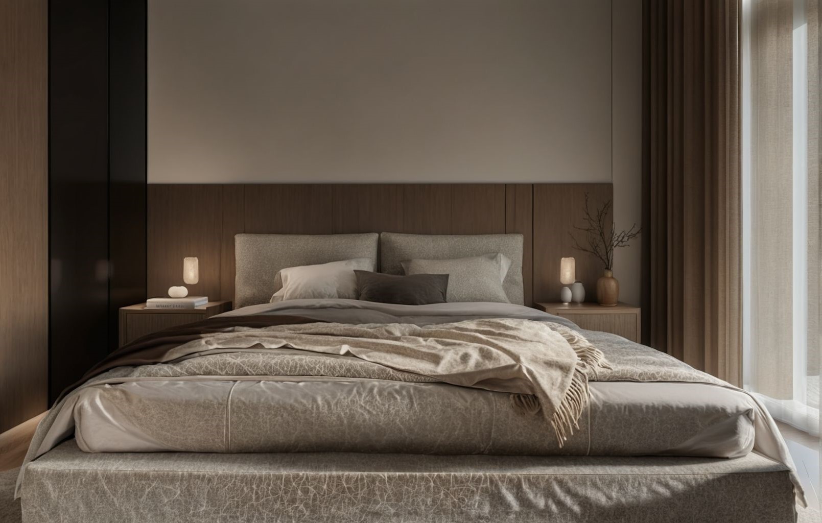 Ten apartament został zaprojektowany jako idealne połączenie prostoty i natury. Użyliśmy neutralnych tonów, miękkich tekstur i naturalnych materiałów do wszystkich akcesoriów, ścian i podłóg. Bardzo ponadczasowy styl japandi pozwoli właścicielowi poczuć zen w środku miasta.